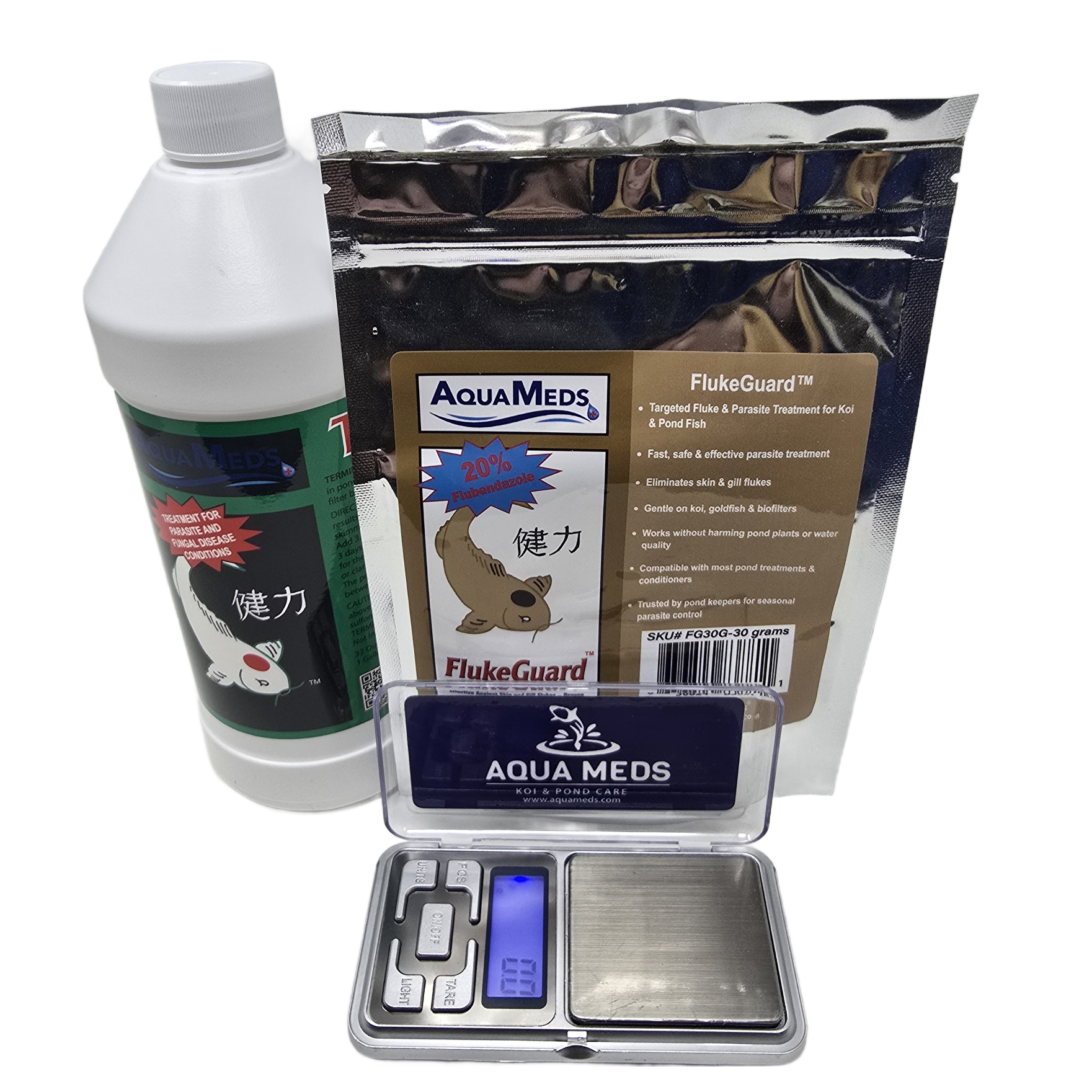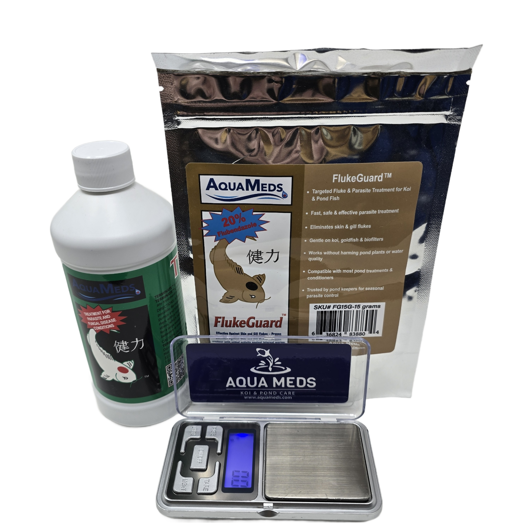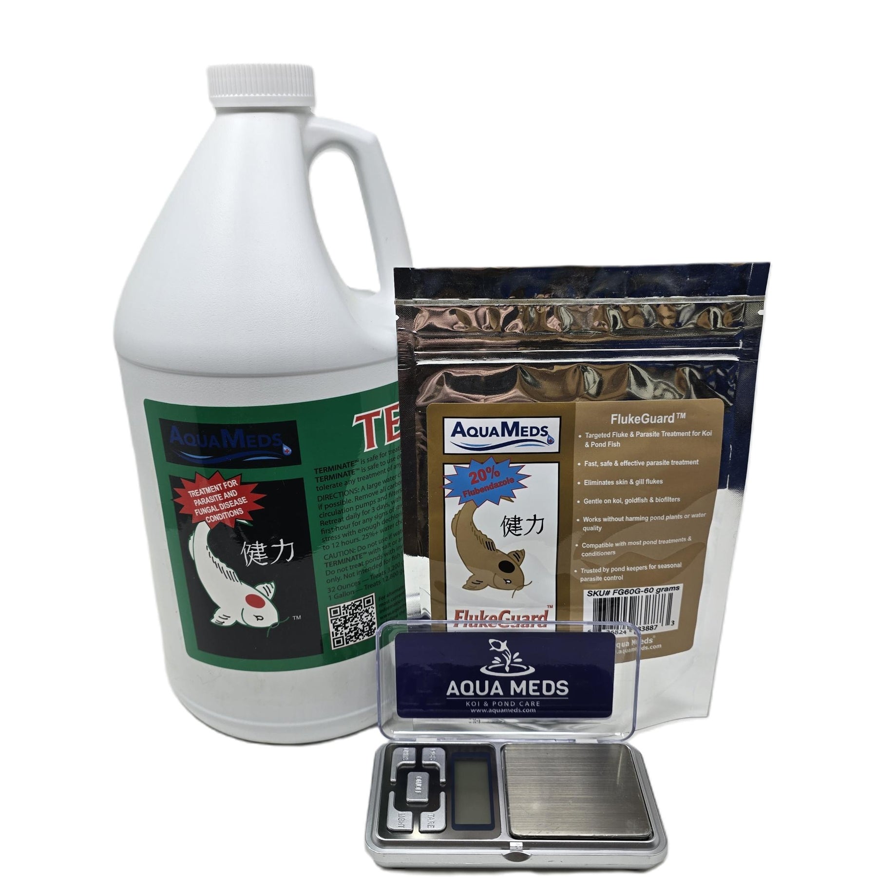 Aqua Meds® Terminate + FlukeGuard Kits combine our proven Terminate™ formula with FlukeGuard™ to help control common external parasites in koi and goldfish ponds. Each kit is sized by pond volume so you can choose the combination that best matches your system, and every kit includes a free digital gram scale to make accurate dosing of FlukeGuard™ easy.